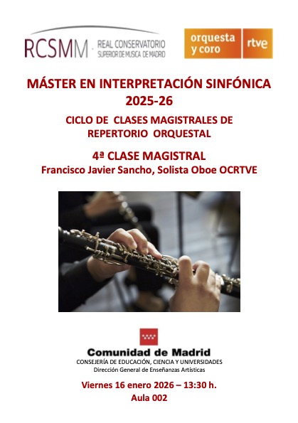 16 Ene , 2026 13:30 Máster de Interpretación Sinfónica. Clase magistral de Oboe a cargo de Francisco Javier Sancho.