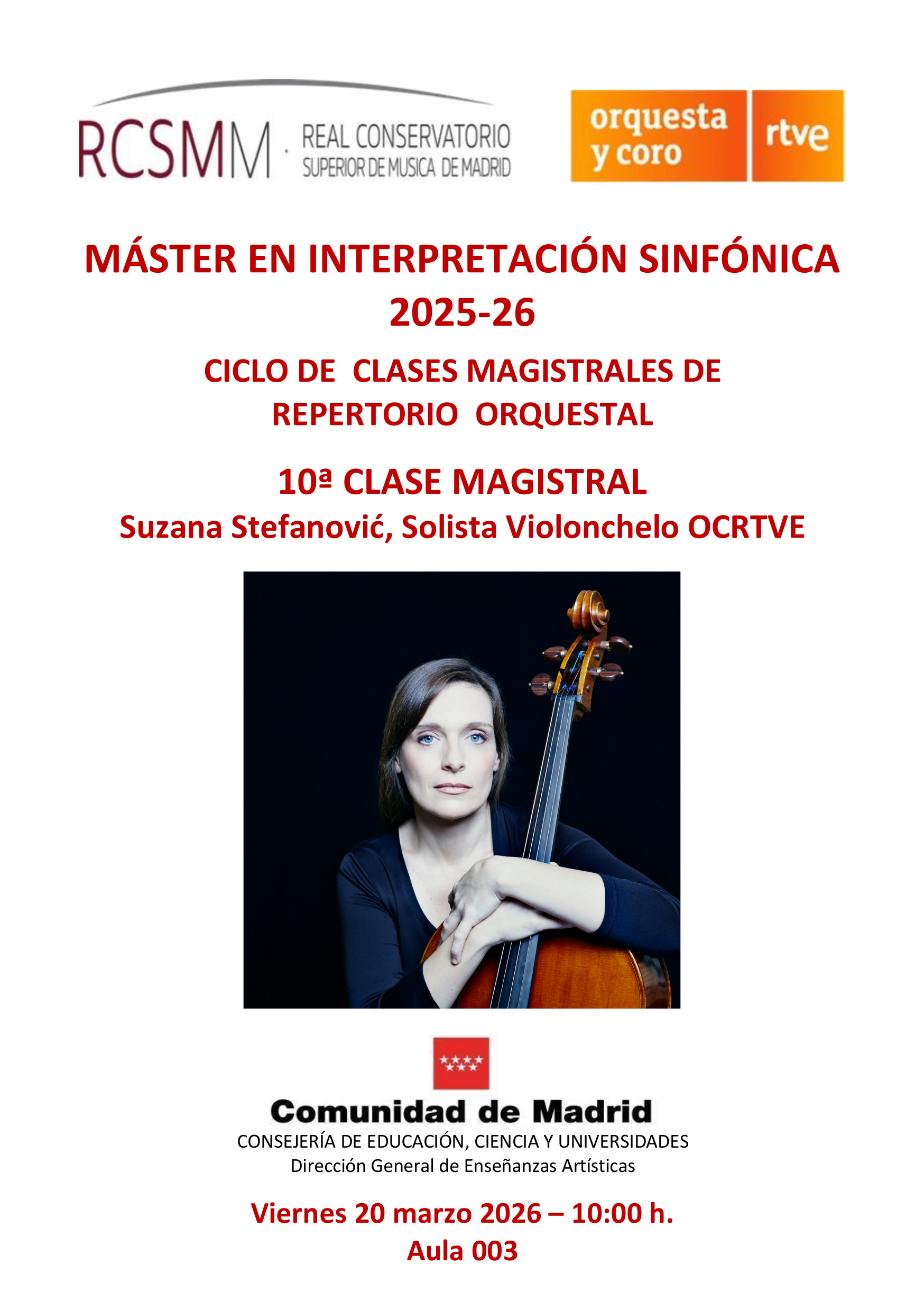 20 Mar , 2026 10:00 Máster en Interpretación Sinfónica. Clases magistrales de Violonchelo a cargo de Suzana Stefanovic